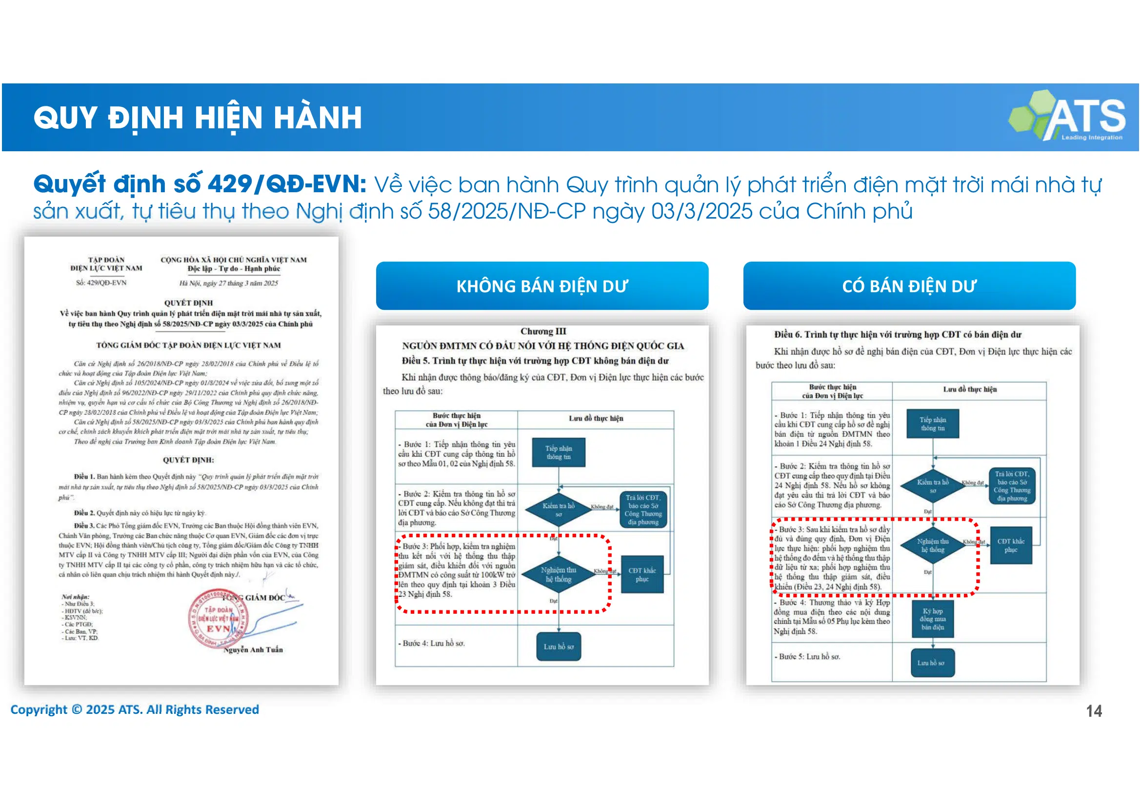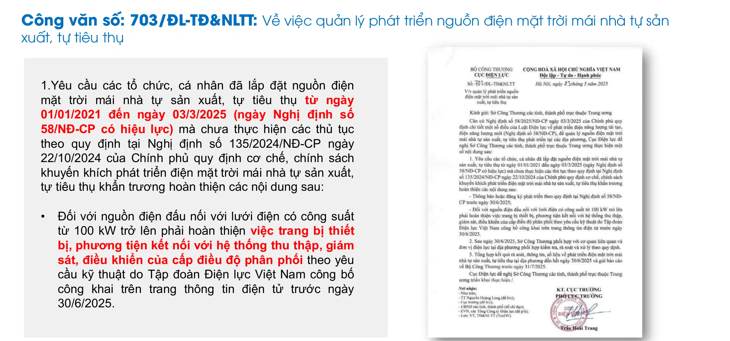 Theo công văn số 703/ĐL-TĐ&NLTT ngày 23/5/2025 của Cục Điện lực (Bộ Công Thương), các tổ chức, cá nhân đã lắp đặt hệ thống điện năng lượng mặt trời mái nhà tự sản, tự tiêu từ ngày 01/01/2021 đến 03/03/2025 cần khẩn trương hoàn thiện các thủ tục theo quy định mới tại Nghị định số 58/2025/NĐ-CP và 135/2024/NĐ-CP.
